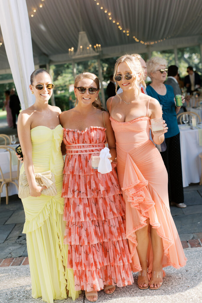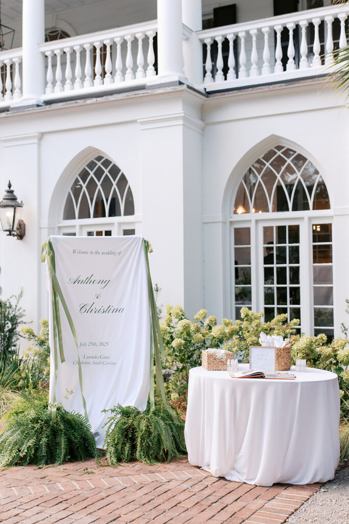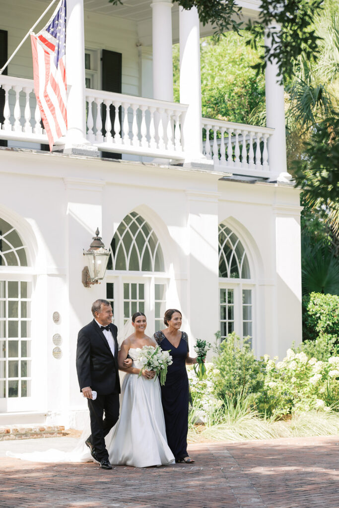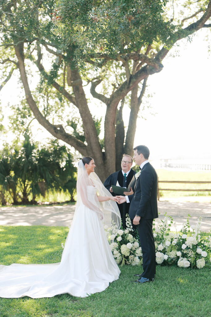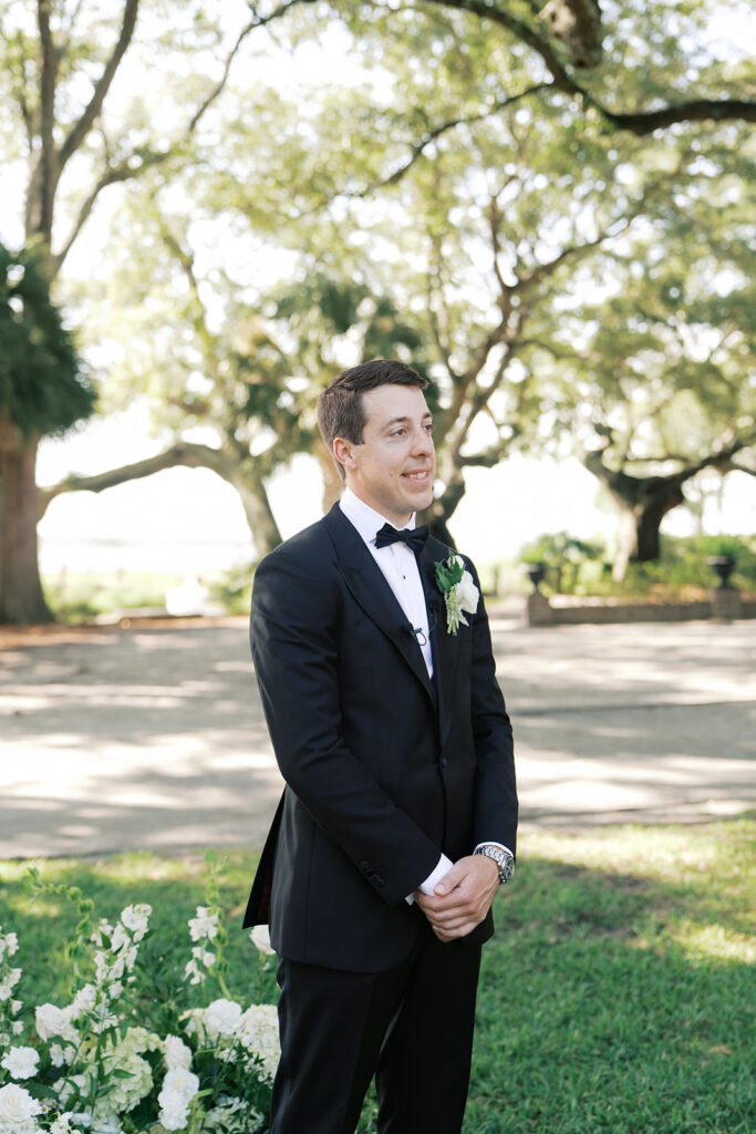 Lowndes Grove sits along the water and features towering oak trees and elegant architectural details. Because of its breathtaking setting, many couples choose this venue for their Charleston weddings. Throughout the property, vibrant summer blooms added color and life to the landscape. Christina wore a beautiful white dress that flowed gracefully with every step, while Anthony looked sharp in a classic suit. Together, they shared excited smiles as the ceremony approached.