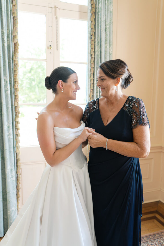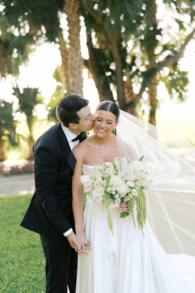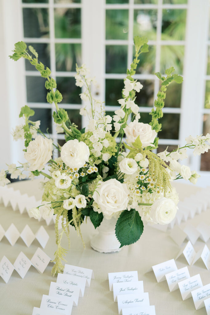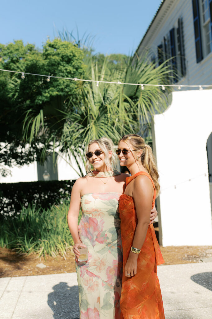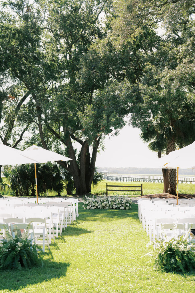 Lowndes Grove sits along the water and features towering oak trees and elegant architectural details. Because of its breathtaking setting, many couples choose this venue for their Charleston weddings. Throughout the property, vibrant summer blooms added color and life to the landscape. Christina wore a beautiful white dress that flowed gracefully with every step, while Anthony looked sharp in a classic suit. Together, they shared excited smiles as the ceremony approached.